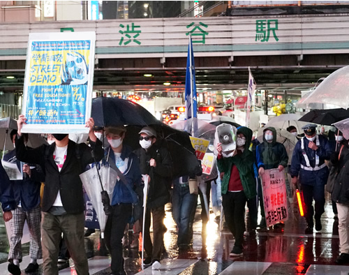17日の東京の行動では、雨が降りしきる中、渋谷ハチ公前でスタンディングおよびリレースピーチを行い、その後渋谷の街をデモ行進しました。この間一緒に活動するようになった学生も友人を連れて参加し、後期の闘いの大事なステップとなりました。