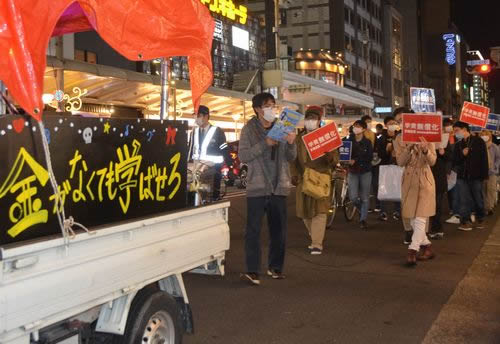 11月20〜22日、全学連が呼びかける全国統一行動「学費無償化STREET ACTION」が行われた。東京では21日に学費減免・渋谷デモ(写真1面)が、翌22日には京都・河原町で京大生を先頭にデモが行われ、広島(20日)、沖縄(21日)、仙台(22日)でも学生がスタンディングアピールに立った。