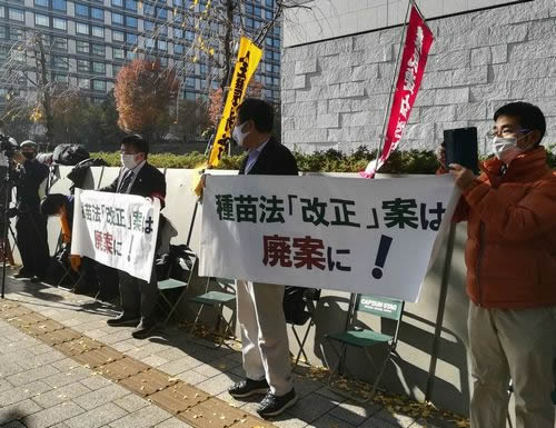 12月2日、参院本会議で種苗法の「改正案」が採決され、自民党などの多数によって可決成立した。国会前では連日多くの農民・農業関係者が抗議の声を上げ(写真)、全国からも「改正」への反対と不安や懸念の声が寄せられる中、それら一切を踏みにじり、わずかの時間で審議が打ち切られ、押し通された。