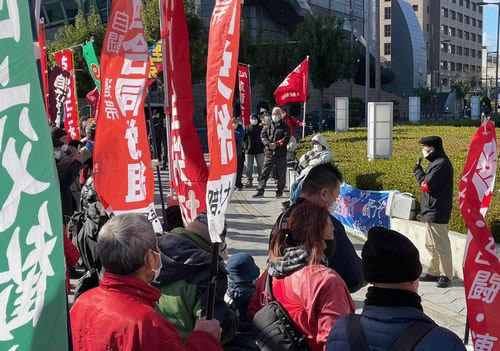 1月1日午前10時、2021年の幕開けとともに、全日建運輸連帯労組関西地区生コン支部への大弾圧に抗議する元旦闘争が、大阪府警前で行われました(写真)。寒風吹きすさぶ中、関生支部の組合員や支援など400人が集まりました。