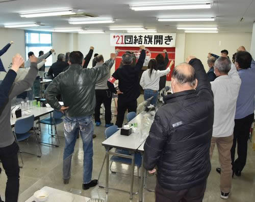 (写真 2021年の決戦への突入を誓って、組合員と支援は団結ガンバローのこぶしを挙げた【1月9日 DC会館】)