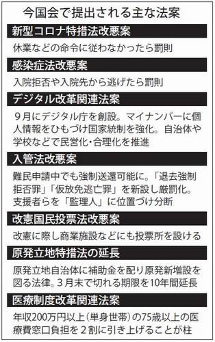 労働者人民の怒りに追い詰められた菅政権は、今通常国会(会期は6月16日までの150日間)で、労働者人民の生きる権利を踏みにじり改憲・戦争国家化を推し進める法案を次々と提出しようとしている。コロナ危機を利用して戦争のできる国へと大転換させる重大な攻撃だ。絶対に許さず、国会闘争に立ち上がろう。法案をめぐる主な攻防点は以下のとおりだ。