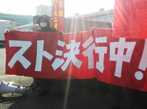 (写真 ロジテム社前で「スト決行中」とアピール【1月21日 福岡市】)