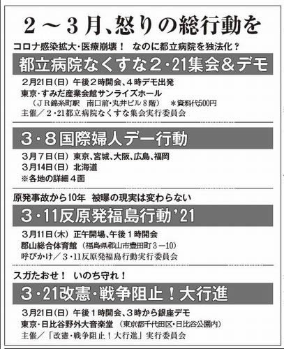 それでもJOC、組織委、国際オリンピック委(IOC)、日本政府・菅首相、東京都・小池知事らは形ばかりの「苦言」を呈すことで世論をかわしつつ、あくまでオリンピックを強行しようとしている。オリンピック利権が失われることを恐れているのだ。 森の首をすげ替えても、問題は決して解決しない。コロナ感染症対策よりカネもうけ、「女性はわきまえろ」という新自由主義と女性差別・分断の東京オリンピックを直ちにやめさせよう。森もろとも菅を打倒するチャンスが到来した。2~3月闘争に立とう。