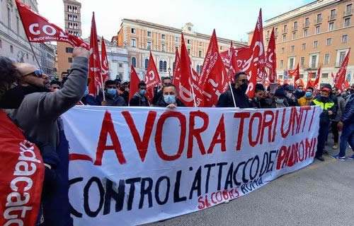 (写真 2月19日に行われたローマでの反政府デモ。横断幕は「労働者は団結して資本と闘おう」)