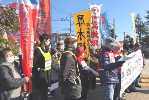 2月4日、米海軍厚木基地(神奈川県綾瀬市)でのCBRN(シーバーン、化学・生物・放射線・核)訓練実施に反対する抗議行動に、婦人民主クラブ全国協議会相模原支部の仲間と共に「改憲・戦争阻止!大行進」の旗を持って参加しました。厚木基地爆音防止期成同盟や神奈川平和運動センターなど4団体の呼びかけで約60人の市民・労働者が駆け付け、「危険極まりない訓練は中止せよ!」「基地の機能強化は許さない!」と抗議文をたたきつけました。(写真)