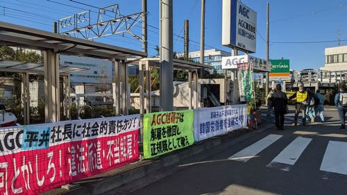 2004年に旭硝子は特恵待遇を得て韓国・クミ(亀尾)市に進出。日本ではその年、製造業への派遣労働が解禁されたが、韓国では今も製造業派遣は禁止だ。そのため旭硝子の韓国法人・旭硝子ファインテクノ韓国(AFK)は、工場内で下請け会社が抱える非正規職労働者を働かせた。いわゆる偽装派遣であり、すでにAFKは韓国で19年2月に不法派遣で起訴され、刑事裁判が進行中だ。労働者地位確認訴訟も19年8月の一審で組合員22人とAFKとの雇用関係を認める勝利判決が出た。