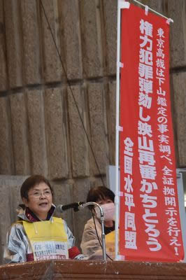 東京・関東、関西などの労組交流センターの労働者ら100人は正午前、日比谷公園霞門を出発。時折強まる風雨をついて「狭山差別裁判糾弾!」「石川さんは無実だ!」「大野勝則裁判長は再審を行え!」とシュプレヒコールを上げながら検察庁前、法務省前を通過。東京高裁前では拳を突き上げ、「下山鑑定の鑑定人尋問を行え!」「下山鑑定で再審をかちとるぞ!」と声を張り上げた。