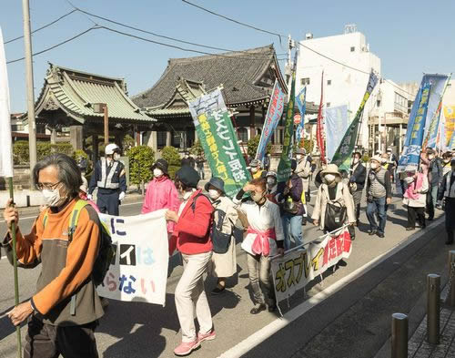 菅政権は〈コロナ×大恐慌〉情勢の中で、改憲・戦争に向かって敵基地攻撃能力の形成や日米軍事一体化を進めています。陸自木更津駐屯地には17機のオスプレイが配備予定で、4月6日に5機目が配備されました。大行進千葉は、オスプレイ配備反対の闘いを発展させることで、配備をつぶす決意です。この闘いは沖縄の辺野古新基地建設を阻止する闘いと連帯する闘いでもあります。