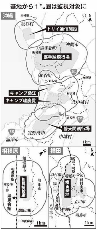 別掲の地図を見てほしい。普天間飛行場や嘉手納飛行場などを抱える沖縄本島の中心部で米軍基地から1㌔メートルの範囲には宜野湾市、北谷町、北中城村、嘉手納町、読谷村のほとんどが入る。幹線道路の国道58号線もだ。ここには多くの基地反対闘争の拠点がある。本土も相模総合補給廠(しょう)周辺、横田基地周辺は密集した市街地で、婦民会館など数々の拠点が存在する。その弾圧が法案の狙いだ。