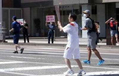 聖火ランナーとスポンサーの大企業の宣伝カーに注目が集まる一方で、私たちの方にも、スマホで写真を撮る人やボードをのぞき込んでいく人などがいて、注目を浴びた。「オリンピックには反対」と、共感する声も聞かれた。