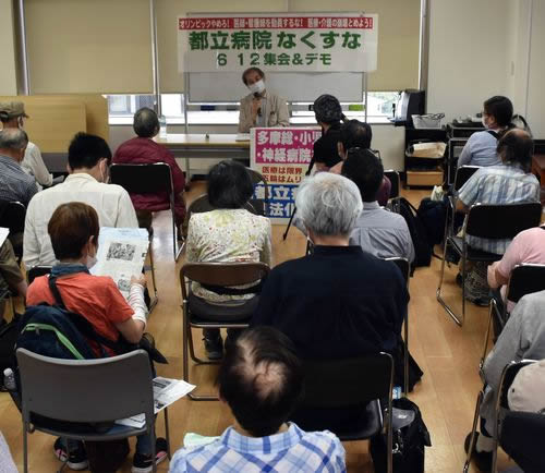 デモに先立ち、国立市で「都立病院をなくすな!6・12集会」を開催。緊急事態宣言をはねかえし、立ち見が出るほどの大盛況でした。
