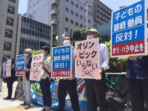 6月1日には五輪組織委員会が各教委に、23日締め切りで希望の「再調査」通知を発しました。しかし必要なのは「中止」です。今後、県内自治体への要請を拡大し、国策五輪に従う教育行政の責任を追及します。この行動を教育現場に持ち込み、「五輪反対・命を守れ」を職場に訴える闘いも始めています。