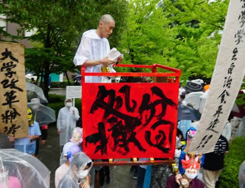 最後に被処分者の学生2人が発言。無期停学処分を受け学内立ち入り禁止となっていた同学会委員長の安田淳敏君は学内に登場し、「大学改革粉砕」「全学学生自治会再建」と書かれたのぼりをはためかせ、みこしの上から熱く訴えた。