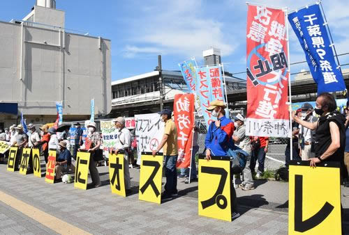 駅前の歩道に横断幕やメッセージボードなどが掲げられ、次々にリレーアピールが行われました。住民の会代表が「7・10を忘れずに闘っていきましょう」と発言したのに続き、元高校の先生から「太平洋戦争の対中戦争で、南京虐殺や重慶爆撃など中国各地に木更津基地から飛び立っていった」との発言があり、侵略戦争での木更津基地の役割が鮮明になりました。