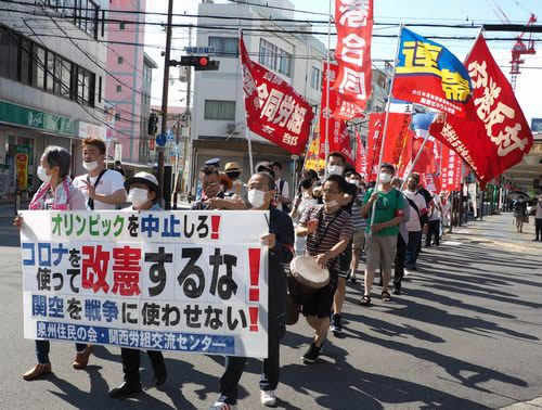 7月11日、大阪府泉佐野市で「オリンピックを中止しろ! コロナを使って改憲するな! 関空を戦争に使わせない!」をメインスローガンに、熱気あふれる集会とデモを闘いました。コロナを口実とする闘争破壊を打ち破り、改憲・戦争阻止の勢いあるデモが泉佐野駅前からスタート。