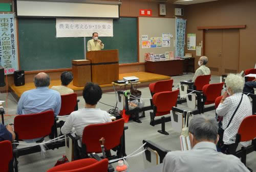 9月19日、群馬県高崎市の中央公民館で、三里塚から市東孝雄さんを招いて農業問題を考える集会が開かれ、およそ50人が結集した。実行委員会には、群馬・市東さんの農地を守る会、群馬合同労組、原発とめよう群馬連続学習会、高階(たかはし)文庫が呼びかけに参加。