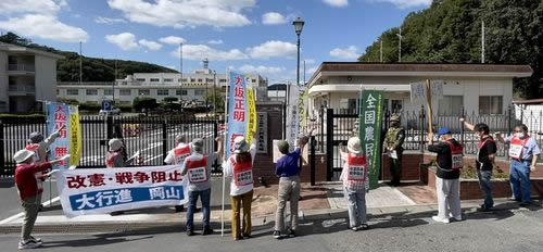 9月15日、改憲・戦争阻止!大行進・岡山は、岡山大学で「陸上自衛隊演習反対、大学の軍事研究反対」のデモ行進を学生と共に行った。19日には岡山県北の日本原駐屯地、岡山市内の三軒屋駐屯地(写真)に対して陸上自衛隊演習反対の申し入れ行動を行った。