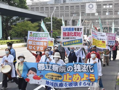 都立・公社14病院独法化に向けた「定款」案が提出された都議会本会議が開かれた10月6日の昼、「都立病院をつぶすな!」署名アクションの呼びかけで東京都庁と都議会を包囲するデモが行われた。午後1時からの審議を前に、周辺を通行する労働者に「定款」案撤回、都立病院独法化阻止を訴えた。