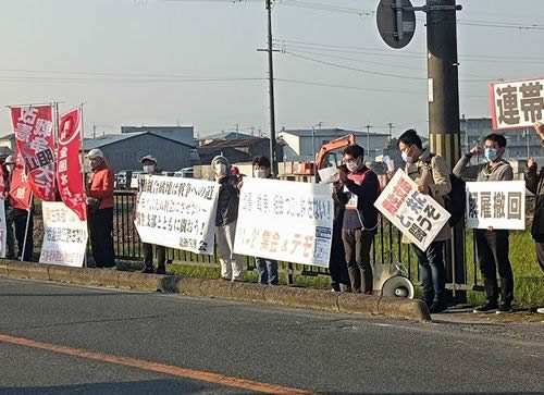 11月20日早朝、「改憲・戦争阻止!大行進奈良」の呼びかけで、吉田生コン社前で関西地区生コン支部組合員への激励行動をやりました。9月に続いて第2弾。地元の奈良を始め関西各地・学生が集まり、総勢40人の行動です。「関生弾圧を許さないぞ! 改憲・戦争阻止!大行進は共に闘うぞ!」 のコールやインターナショナルの大合唱が響き渡りました。ものすごい迫力でした。