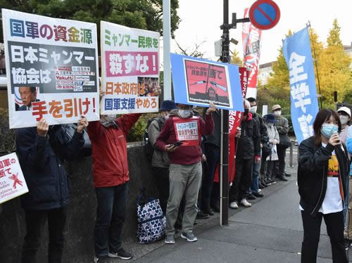 日本ミャンマー協会は2011年12月に設立された一般社団法人で、日本政府と財界が一体となってミャンマーへの経済侵略を進めるための機関。内閣副総理・財務相の麻生太郎をはじめとする政治家や元ミャンマー大使らが役員を務め、21年3月時点で日本を代表する大企業137社が加入していた(その後数社が脱退)。