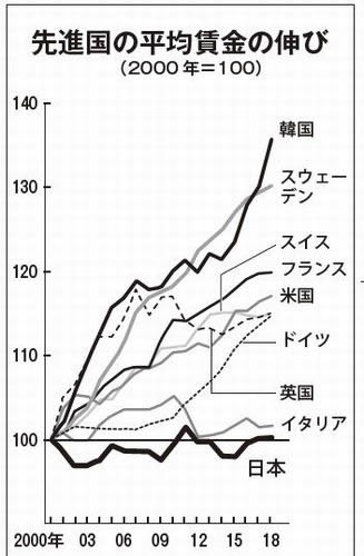 労働組合の力が著しく後退する中で、今や非正規職労働者が全労働者の4割を占め、労働者の平均賃金は主要先進国の中で唯一、大きく下落してきた(グラフ参照)。