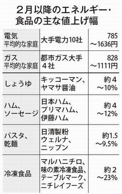 電気・ガス、しょうゆやハム・ソーセージなど生活必需品が軒並み値上がりしている(表参照)。消費者物価指数が2%上がれば1世帯の家計負担は年5万6千円増えるという。その分が実質的な賃下げとして労働者を直撃する。分断を許さず正規職・非正規職の一律大幅賃上げが絶対に必要だ。雇用も賃金も闘うことでしか守れない。22春闘を反転攻勢の時としよう。