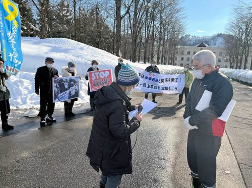 クーデター1周年の2月1日、とめよう戦争への道!百万人署名運動・新潟の主催で南魚沼市にある国際大学の正門で「国際大学はミャンマー国軍との関係を断て」「国軍によるミャンマー人民虐殺弾劾」「国際連帯で闘おう」と申し入れました。