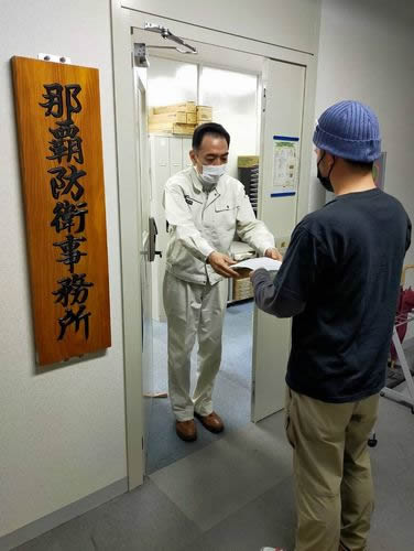 続いて沖縄防衛局那覇防衛事務所に移動し、那覇軍港での大規模訓練の中止と軍港の即時無条件返還を求める申し入れを行いました(申入書別掲)。許しがたいことに防衛局は「コロナでの分散出勤」「人手不足」を理由に申入書の受け取りを拒否し、嘉手納町の沖縄防衛局本庁に提出するよう指示を出してきました。辺野古ゲート前での座り込みの監視に毎日職員を派遣したり、沖縄県が「目的外使用」と抗議する那覇軍港での訓練や1万人規模の軍事演習を擁護しながら申入書の一枚すら受領しないというのです。断固、門前で抗議した上で申入書を受け取らせました。