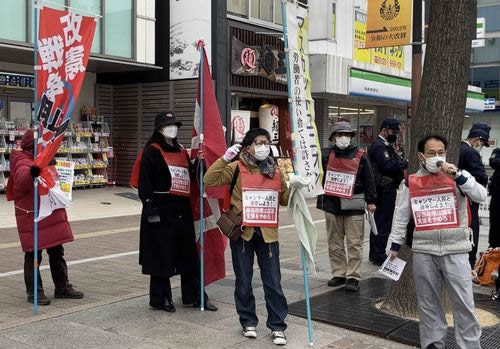 2月1日、岡山駅前で、改憲・戦争阻止!大行進岡山が、ミャンマー(ビルマ)連帯街宣に取り組み、ビラ配布とリレーアピールを行った。
