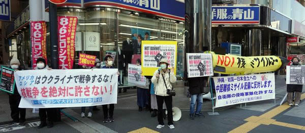 東京では2月28日、杉並区役所前で洞口朋子杉並区議を先頭に全学連や東京西部ユニオンの労働者など約20人が「プーチンもNATOもウクライナから手を引け! 岸田政権の改憲・核武装を許さない!」と訴え、街頭スタンディングを闘った。