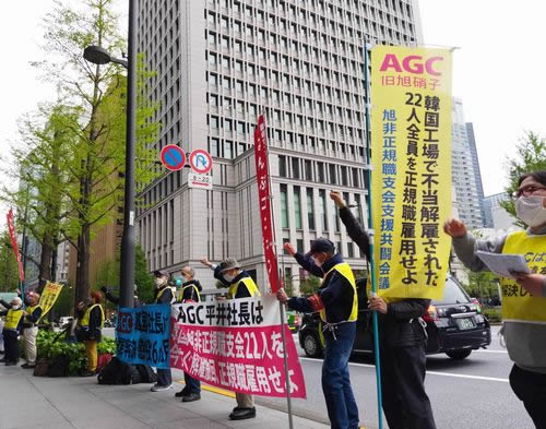 (写真 AGC本社に「平井社長は解雇撤回し正規職雇用しろ」と怒りのシュプレヒコール【4月21日 東京・丸の内】)