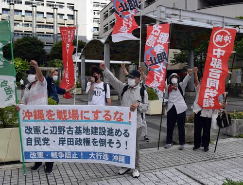 沖縄・那覇市では28日、改憲・戦争阻止!大行進沖縄と沖縄大学学生自治会の共催で県庁前スタンディングとデモを行い、戦争反対と全基地撤去を訴えました。右翼が街宣カーで大音量を流して妨害に来ましたが、飛び入りで参加する人や右翼に抗議する人も現れ、妨害を蹴散らしてスタンディングをやりぬくことができました。