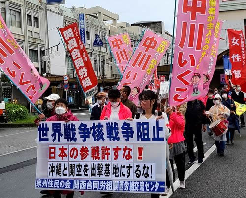 大阪府泉佐野市では29日、関西合同労組、泉州住民の会、関西労組交流センターの主催で4・28沖縄反戦デー集会とデモを闘いました。集会で基調報告を行った中川いくこさんは、「ウクライナ支援を口実に岸田政権は自衛隊を派遣し、同時に中国侵略戦争で再び沖縄を戦場にしようとしている。今こそ戦争反対の声を挙げよう。泉佐野市議選に勝利し、日米会談・クアッド会合粉砕!5・22全国総決起闘争に攻め上ろう」と訴えました。関西生コン支部の武谷新吾書記次長、改憲・戦争阻止!大行進関西の冨山小太郎さん、関西合同労組の組合員、全学連が発言し、関西合同労組の黒瀬博匡委員長のまとめと行動提起を受けた後、泉佐野駅までデモを行いました。