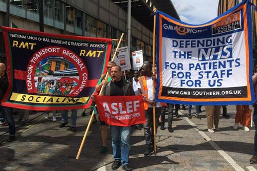 (写真 「社会主義」をうたうロンドン交通地域協議会の旗を掲げるRMTとASLEFの組合員。NHS民営化に反対して闘う病院清掃労働者がともに行進【6月25日 ロンドン】)