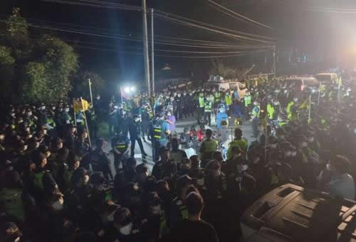 韓国の慶尚北道星州(ソンジュ)郡ソソンリで9月14日夜、住民を先頭にサード(高高度迎撃ミサイルシステム・THAAD)基地への米軍車両搬入の実力阻止が闘われた。亀尾(クミ)から旭非正規職支会も駆けつけた。チャホノ支会長は「夜8時半から深夜まで3時間半格闘した。最終的に米軍車両が入ったが、よく闘った」と語った。
