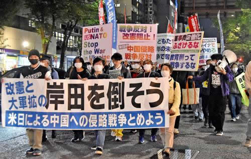 10月20日、改憲・戦争阻止!大行進東京が呼びかける防衛省への反戦デモと抗議行動が100人の結集で闘われた。中国侵略戦争に向けた過去最大の大軍拡予算、敵基地攻撃能力保有を焦点とした安保関連3文書改定、辺野古新基地建設と南西諸島への自衛隊ミサイル部隊配備に怒りを爆発させ、岸田打倒を訴えた。
