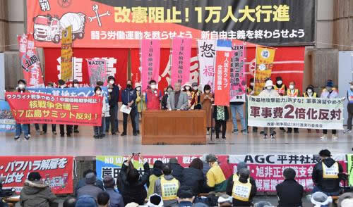 東京の郵政非正規労働者が、郵便事故の責任をなすりつけられての不当な処分への怒りを語り、パワハラが横行する職場を安心して働ける職場に変えるために闘うと決意を述べた。一陽会労組の坪井静委員長は、戦時下でこそ「医療と戦争は相いれない」ことを鮮明にして闘うと表明した。