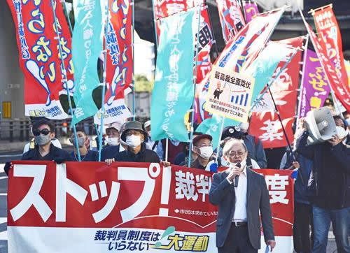 制度発足以来13年、現代の徴兵制=裁判員制度はついに崩壊局面に突入した。裁判員に選ばれた人の23・7%しか呼び出しに応じていない。また現職裁判官の中から「(裁判員との)実質的な意見交換ができない」「制度導入の目的は達成されなかった」という声が噴出し始めた。こうした新局面を踏まえて、今こそ「大運動」の蓄積を発揮して、裁判員制度を廃止に追い込もうと、この日のデモが闘われた。
