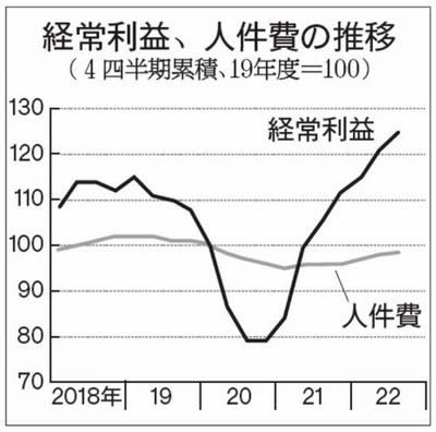 12月1日発表の財務省・法人企業統計調査では、今年7~9月期の経常利益(金融業・保険業を除く)は前年同期比18・3%増で7四半期連続の増益となった。コロナ流行前より経常利益は2割増え、人件費は1・7%減った(表)。この10年間で配当金は2・5倍に膨れ上がっている。大資本はコロナ下で、ウクライナ戦争と円安ゆえの資源・原材料費高騰を価格に転嫁する一方、労働者の賃金・福利厚生費、人員を減らして巨額の利益を得ている。その構図は明らかだ。戦時下の価格引き上げと強搾取・収奪で労働者を一層の貧困に追い込むことで肥え太っているのだ。労働者の生き血を吸って戦争に突進する最末期帝国主義の姿そのものである。