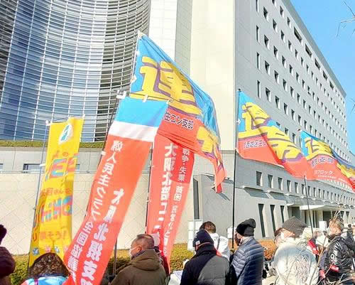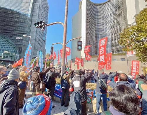関西生コン支部への弾圧を打ち砕くため、1月1日、大阪府警本部に対する抗議行動が打ち抜かれた。関西生コン支部の組合員をはじめ460人が結集し、2時間にわたるリレーアピールが行われた。