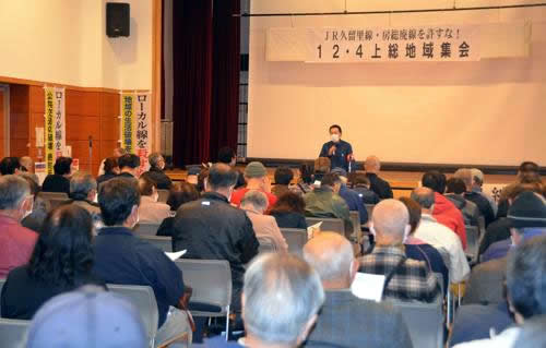 (写真 ダイヤ改定は廃線を狙う攻撃だ。昨年12月4日、動労千葉木更津支部が久留里駅近くの会場で開いた久留里線廃止反対集会には地域の住民が多数参加し、関道利委員長の解説に耳を傾けた)