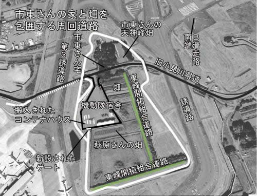 市東さんの家と畑、開拓組合道路と萩原富夫さんの横川の畑を取り囲む形で、周回道路が造られてきた。この道路を成田空港警備(NAS)の車が日常的に走り、市東さんの家周辺を監視している(図)。1月17日にはこの周回道路と機動隊宿舎をつなぐ「ゲート」が設置された。この道路とゲートを使って準備を整え、機動隊宿舎を「基地」として襲いかかってくることが容易に予想される。農民が祖父の代から血と汗を流して耕してきた農地を、法律に基づく判決の執行という体裁で、力ずくで奪おうとしている。絶対に許すことはできない!
