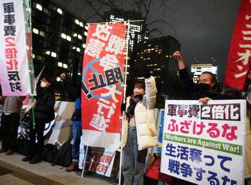2月3日夜、改憲・戦争阻止!大行進東京の呼びかけで、大軍拡予算案粉砕!国会闘争が闘われた。国会裏の衆議院第2議員会館前に50人が結集した。全学連が闘いをけん引し、「改憲・戦争の岸田政権を打倒するぞ! 米日の中国侵略戦争を阻止するぞ!」と、野党総屈服の翼賛国会を弾劾して怒りの声を上げた