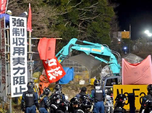 ❸16日午前0時、市東さんの畑に重機が突入し、ビニールハウス、農機具小屋などを破壊。看板やぐらで高所籠城を続ける全学連2人が旗を振り、渾身(こんしん)の戦闘的アジテーションを行った。午前3時、警察は高所作業車で2人を排除しようとした。2人は徹底抗戦し、公務執行妨害で不当逮捕。未明にも学生1人が不当逮捕された。