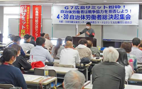 広島市内で4月30日、全国労組交流センター自治体労働者部会と8・6ヒロシマ大行動実行委員会の共催で「G7サミット反対!自治体労働者は戦争協力を拒否しよう」と呼びかける自治体労働者総決起集会&デモをかちとった。全国から自治体労働者を中心に100人が参加した。
