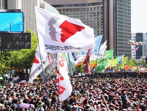 韓国ではユンソンニョル大統領就任1年を前に全国民主労働組合総連盟(民主労総)が「労働改悪阻止!ユンソンニョル審判!」を掲げてメーデー大会を開催。ソウルに3万5千人、全国15地域で計13万人が結集し、ソウルでは龍山(ヨンサン)の大統領室、ソウル雇用労働庁、憲法裁判所へのデモが行われた。