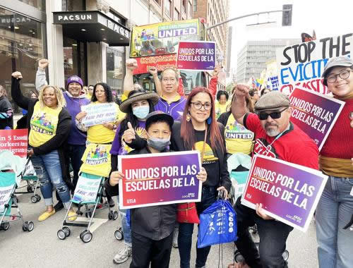 アメリカでは労働運動の拠点カリフォルニアをはじめ各地で行動が行われた。ロサンゼルスでは3月にストを打ち抜き賃上げをかちとったロサンゼルス統一教組(UTLA)・学校スタッフの組合SEIUローカル99が共にデモ。サンフランシスコでも国際港湾倉庫労組(ILWU)ローカル10などが港へデモした。