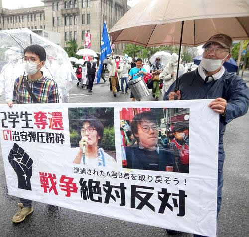改憲・戦争阻止!大行進京滋と全学連の共催で京都反戦デモが5月7日に闘われた。デモ隊は2学生への不当弾圧(前号既報)への怒りを爆発させ京都市内をデモ行進した。