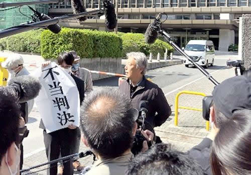 (写真 大阪高裁前で取材に応じる松本オーナー【4月27日】)